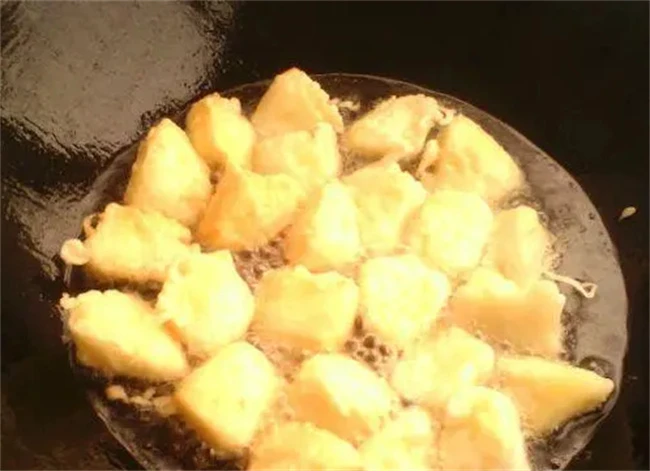 锅里面油温6成热的时候把苹果放进锅里面炸。大概在1~2分钟左右,不能炸的时间太长,时间越长越软就会出水。锅里面加上一勺水,再放入适量白糖小火烧开,糖完全融化之后,水差不多烧干再滴入几滴食用油。熬糖的过程中,勺子一定要不停的搅动避免糊锅,熬糖新手一定要全程开小火。不停的搅动,当糖变成金黄色,冒小泡就可以关火,加入炸好的苹果,快速翻拌均匀。