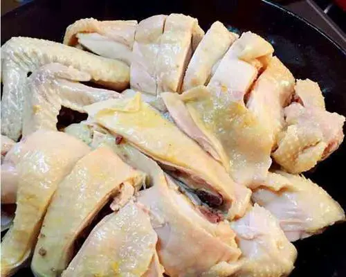 煮好的鸡肉取出后,需要将鸡放入冰水中浸泡,这样可以使鸡肉更加入味。