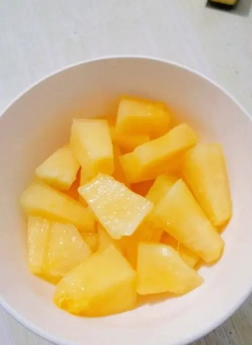 准备工作:将百香哈密瓜削皮去籽,切成小块,备用。