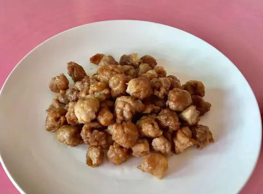 将适量淀粉均匀裹在猪肉块上,放入油锅中油炸至表皮微黄即可。将荔枝果肉切成小块,放入炸好的猪肉上面,轻轻搅拌均匀,盛盘即可食用。