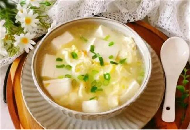 豆腐可以选择嫩豆腐,也可以选择老豆腐切成细丝,然后用开水把豆腐烫一下锅,里面少加一点油,放点葱花炒香之后加水烧开,然后把豆腐丝下到里面煮一会儿可以加上一点虾皮儿紫菜,煮到汤里面出现浓浓的豆腐味儿,然后用水淀粉勾一下芡,把鸡蛋打散淋在汤里面,烧开就可以了。