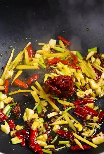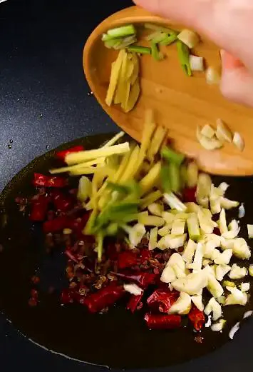3. 起锅烧油,油热后倒入麻椒、干辣椒、葱姜蒜,翻炒至出香味。