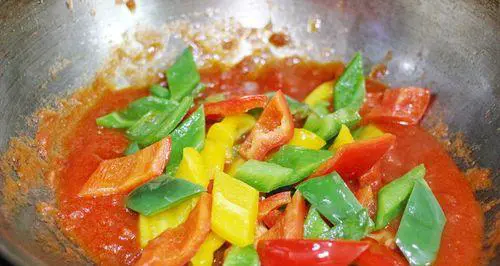 在炒豆腐过程中,我们需要依次加入葱姜蒜末、咕噜肉和青红椒等调料,翻炒均匀。最后将焯烫过的菠萝块倒入锅中,用小火翻炒至菠萝变软烂。