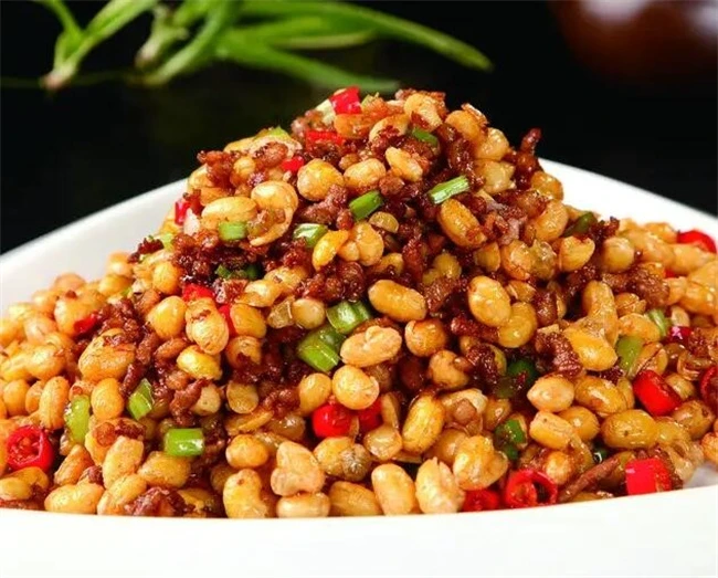 第3道补钙的菜肉末炒黄豆,大家都知道黄豆的钙含量是特别高的,把黄豆提前用清水浸泡一天,看豆子明显的胀大,如果不着急的话,可以把豆子捞出来,放在温暖的地方保湿,等豆子长出小嫩芽之后再炒,也特别好吃,瑞典五花肉末质量葱姜蒜,锅里面烧油。葱花,姜末蒜末放进去爆香,然后把五花肉末倒进去翻炒,炒至变色,微微有点发黄,再把泡好的黄豆倒进去,大火炒加盐,十三香,蚝油调味儿,调料都炒均匀以后,加入适量清水盖上盖子,小火炖5分钟左右,黄豆成熟,临入式的氧水淀粉勾芡就能出锅。