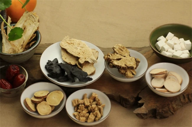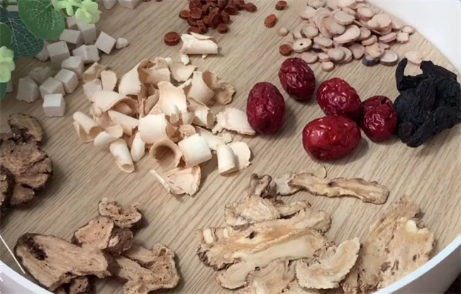 所需要的材料有党参,茯苓,当归,川芎,白术,熟地,白芍,炙甘草各9克。所有的药材都准备好之后,再切几片生姜,不要太多,大概三片左右就可以了,一份汤再放入5个大枣大枣一定要切开,这样更容易出味。所有的药材都放进砂锅里面。加入6碗清水,大火烧开之后转成最小火慢慢煮,大概6碗水煮成两碗水。把药汤倒出来之后,再加入三碗水,煮成一碗水,把药汤和之前的两碗水混合。