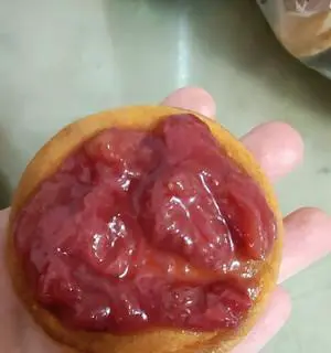 7.压扁面团:将每个小块的面团压扁,加入适量的草莓酱。