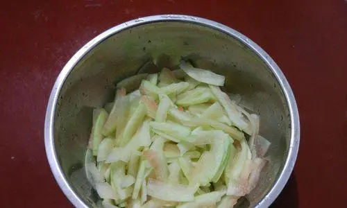 选择新鲜、质地好、无斑点和损坏的西瓜皮。猪肉切片要薄而宽。