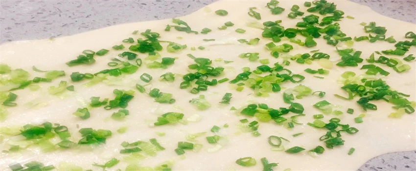 面团发酵好之后将面团分成大小相等的长条状,在案板上不断地进行揉搓使得面团的韧性变得更好,揉搓好的面团分成大小均匀的小份在案板上进行擀薄,并且擀薄的时候还可以将准备好的葱花,芝麻盐和一系列的调味品放入的面皮当中,使其葱油饼的口感变得更加丰富。