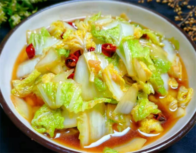醋溜白菜:这可以说是白菜最简单的家常做法,把新鲜的大白菜洗干净,菜白用斜刀片成薄片,菜叶也切成大一点的块。准备适量姜片,蒜片,葱末,干辣椒。锅里面油烧热之后,把香料放进去炒香,先把菜白放进去,炒至变色,然后再把菜叶放进去翻炒,加入适量盐,翻炒均匀之后再。加入适量老陈醋快速翻炒出锅的时候,稍微加一点白糖,淋入水淀粉勾芡即可。