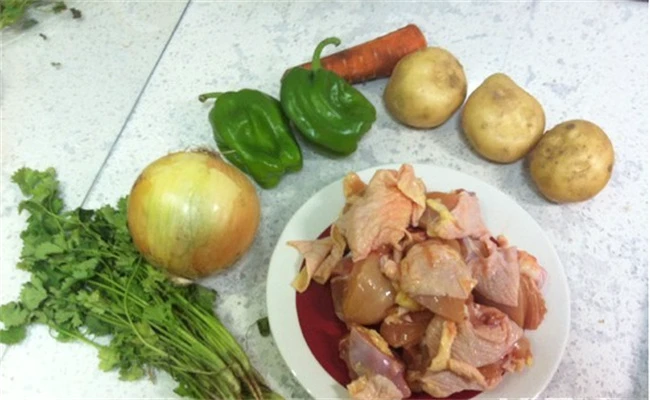 另起一个锅,多烧点油油,温5成热的时候把土豆放进去炸到外,皮有些发黄,捞出来被用。喜欢吃面这个时候也可以活一点软面擀成面皮放在锅里面煮熟,鸡块成熟之后装在盘子里面。炖鸡的时候中间要翻动几次,避免锅底下的粘锅。大概在30分钟左右,这块已经成熟的差不多了,炸好的土豆和洋葱块以及青红椒块倒进去翻炒均匀。