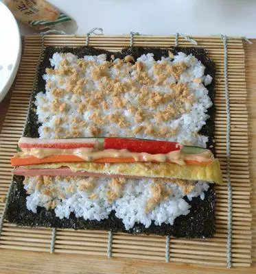 将海苔铺在寿司卷帘上,用手将饭均匀地铺在海苔上,留出一部分空白的海苔。接下来,将填料均匀地放在饭上,卷起来即可。