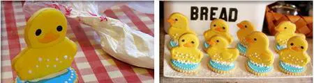7.再用淡奶油在蛋糕上进行修饰,让小鸭子更加可爱。