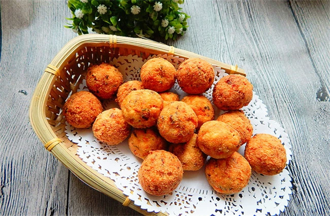 如果操作手法比较慢,可以先把丸子做好了放在。案板上,有生热以后,再把丸子一个一个的剪到锅里面,小火慢慢炸,刚开始下锅之后一定不能搅动,豆腐丸子是特别容易碎的,如果刚下锅还没有定型就搅动你会得到一锅豆腐渣。当丸子变色定型之后,再用勺子轻轻推动。炸到丸子金黄熟透,捞出来可以直接吃。香香脆脆的口感特别好。