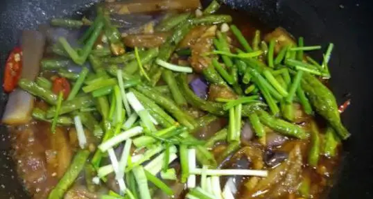 给锅中放入适量的食用油,把姜丝,葱丝还有蒜瓣放入锅中爆炒之后把炸好的豆角以及茄子条都放入锅中进行翻炒翻,炒的过程当中可以放入适量的小米辣,可以根据自己的口味来添加。