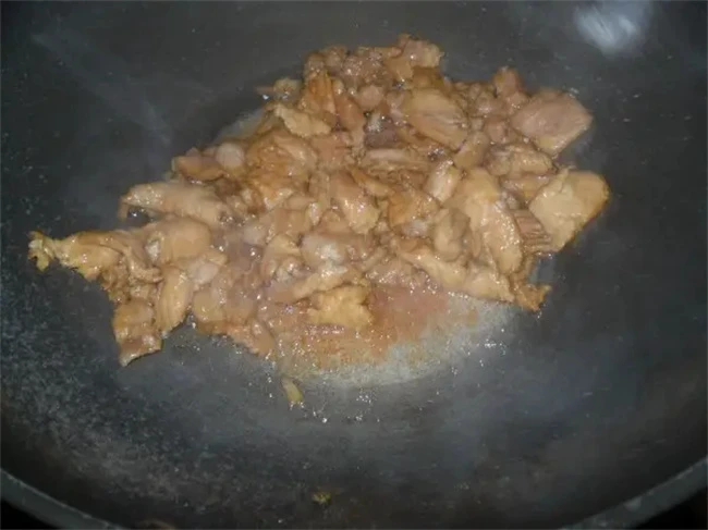 第三步炒瘦肉。起锅烧油,油热后下入准备好的干辣椒,生姜,葱段,不断的进行翻炒,直到炒出香味,我们再放入腌制好的瘦肉丝,继续不停的翻炒,将瘦肉丝搅散,等到时候三变色炒熟即可。