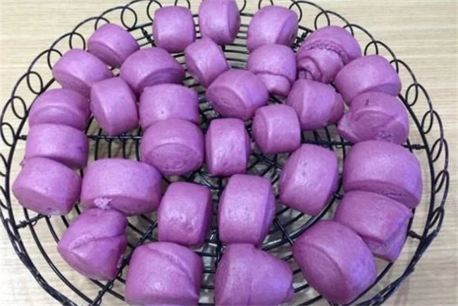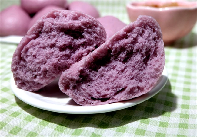 紫薯馒头也是同样的做法,先把紫薯去皮切成片上锅蒸熟,趁热拌紫薯压成泥,然后加入适量纯牛奶,白砂糖,酵母粉搅拌均匀之后再加入适量面粉,也可以滴上几滴白醋,这样蒸出来的馒头比较紫有点粉嫩的感觉,如果加入适量碱或者小苏打蒸出来的馒头就是蓝色的也是特别好看。最主要是和面的时候一定要软硬适中,如果喜欢吃比较鲜软的馒头,可以把面弄的稍微软一点。