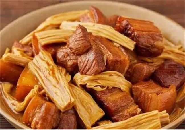 红烧肉炖腐竹也是特别好吃的,这种做法,我感觉吃腐竹要比肉还好吃。把腐竹用温水浸泡软,买回来的五花肉切成小块儿洗干净,勒点葱,段姜片,几粒花椒,一个八角锅里面烧油,把五花肉放进去炒至赖皮发黄,然后把葱姜等调料放进去炒香,加入适量老抽调色,然后加入适量开水开大火。开始之后转中小火,慢慢炖40分钟左右,然后把腐竹放进去,加一点盐调味再继续炖5分钟左右就能做好了。