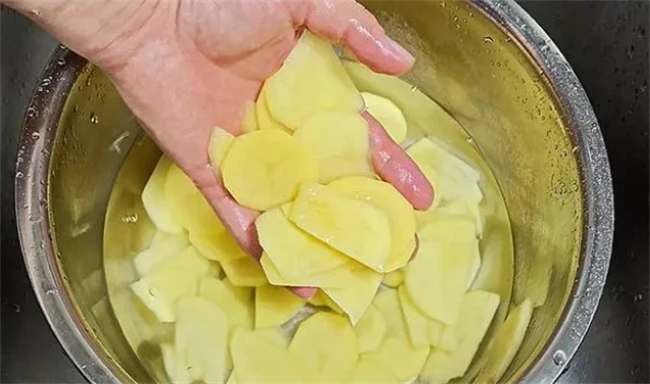 所有的食材都准备好之后,开始制作过程,土豆先去掉,皮洗干净,切成三毫米左右的厚片放在清水里面浸泡,一会儿青红椒改刀成菱形块,五花肉切成片。洋葱切成丝,做干锅的菜,洋葱是必不可少的,用洋葱垫底,菜的味道会更好。食材都改到完成之后,锅里面烧多点油。土豆片捞出来放在篮子里面沥干水分,油温5成热的时候把土豆片下进去炸至成熟定型。