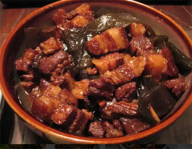 红烧肉炖海带也很简单。先准备适量五花肉,用刀把肉皮上的脏东西刮干净,然后用清水反复冲洗两遍把五花肉改造成大小合适的块儿,锅里面加入适量清水,姜片,葱段,然后把肉块放进去,大火煮开捞出血沫,然后把肉捞出来放在大碗里面,锅里面加一点油,加入适量冰糖炒出枣红色,把五花肉放进去炒至上色。加入适量开水,然后放料酒,葱,姜大料,花椒,大火煮开之后炖10分钟左右把海带放进去一同炖熟,出锅的时候加入盐调味即可。