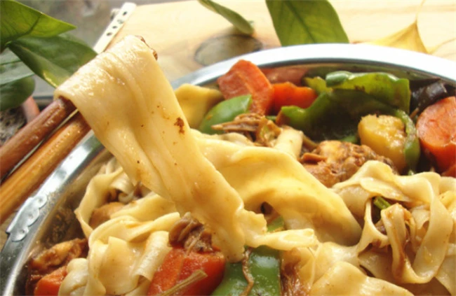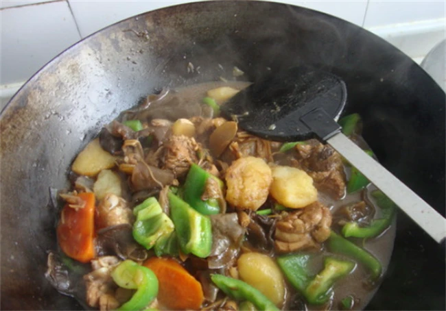大盘鸡是必须要配上点宽面片吃起来才好吃的,所以提前准备点比较软的面,在鸡肉快成熟的时候。把面片放在锅里面煮熟铺在盘子,底下鸡块炖熟之后,直接连汤一起倒到盘子上面,让面条吸满汤汁,吃起来味道特别香。一盘好吃的大盘鸡,主食和菜都已经配齐,如果喜欢吃米饭,也可以蒸点米饭,用大盘鸡的汤泡米饭吃,也是贼拉香的。