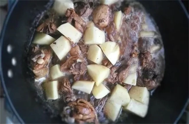 第五步下土豆。我们向锅中加入切好的土豆,不断的进行翻炒,一直到土豆断生,再向锅中加入适量的清水,开大火炖煮一段时间。