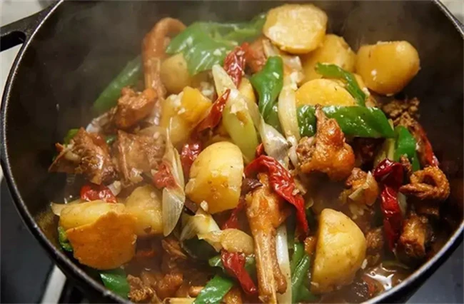 第六步下入配菜。土豆变软后,我们将切好的彩椒,以及其他的配菜放入锅中,不断的进行翻炒,然后开小火进行慢炖,炖煮一段时间,我们大火收汁,可以加入一些水淀粉进行勾芡,之后将其盛出装盘即可,这样美味又好吃的大盘鸡就制作完成了。