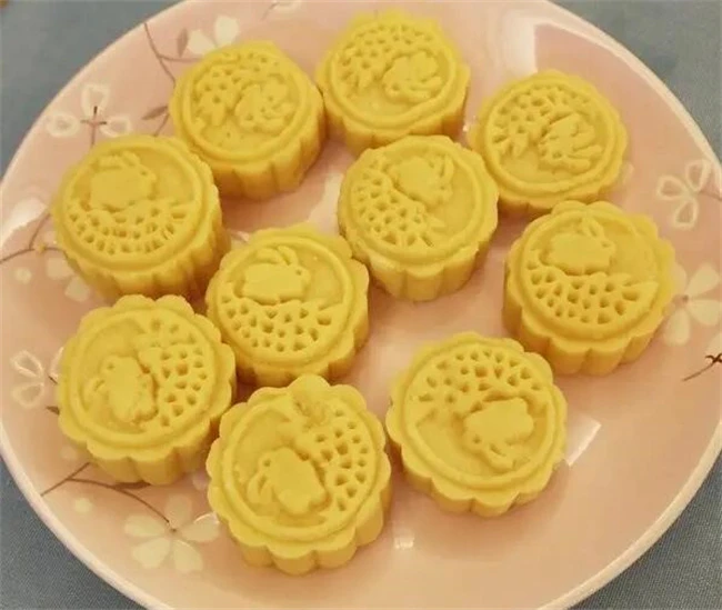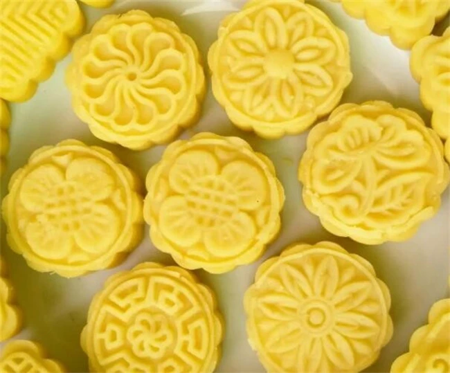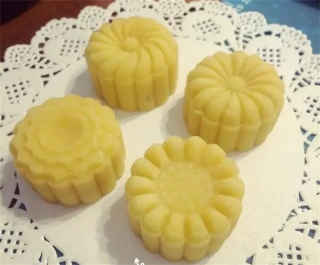绿豆泥炒干用刮刀切开能看见分开的绿豆泥,但是刮刀上不会粘着,这样就表示绿豆泥炒好了。如果用关刀切一下没有分割出来的叶,说明还比较湿,需要再炒一会儿。炒好的绿豆泥,分成30克左右的剂子用模具压出形状和花纹,放在冰箱冷冻里面定型。