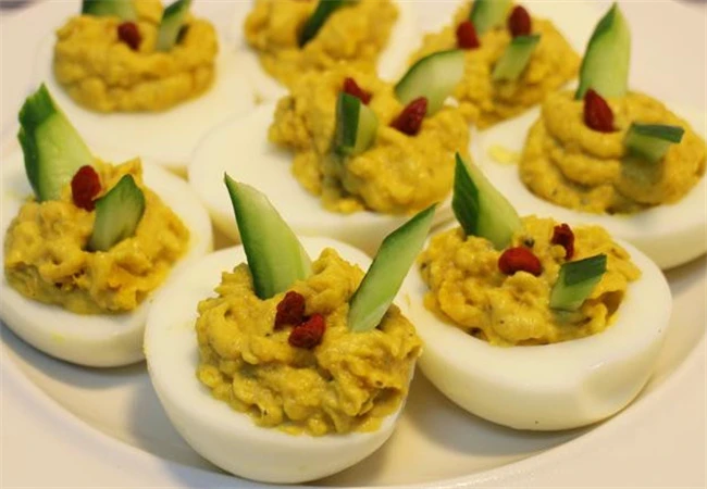 把鸡蛋泥和南瓜泥混合之后加入少许食盐黑胡椒,碎和沙拉酱搅拌均匀就制作成了馅料,然后把馅料。装进蛋白里面插上小黄瓜做装饰。枸杞用温水清洗一下,放到南瓜泥上面。做出来的馅料是比较多的,鸡蛋白里面装不完可以把。剩下的部分加在面包里当早餐吃,味道也是爽歪歪。不喜欢加面包的话也可以直接吃,味道和口感也是特别好的。香甜的沙拉酱配上黑胡椒的味道,特别能刺激味蕾。
