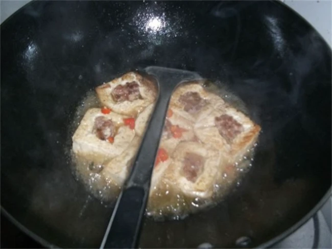 把锅里面加入适量清水,然后加味极鲜酱油老抽,适量盐蚝油调味水开之后,把炸好的豆腐放进去,小火慢炖,大约炖5~10分钟左右,速干汤汁,出锅的时候撒上点儿小葱花,好吃的酿豆腐就做好了。这个菜可以叫做酿豆腐,也可以叫做红烧酿豆腐,反正味道是特别好吃的,吃过很多版本的酿豆腐,只有这个版本是让我觉得最值得亲手尝试的一道菜。