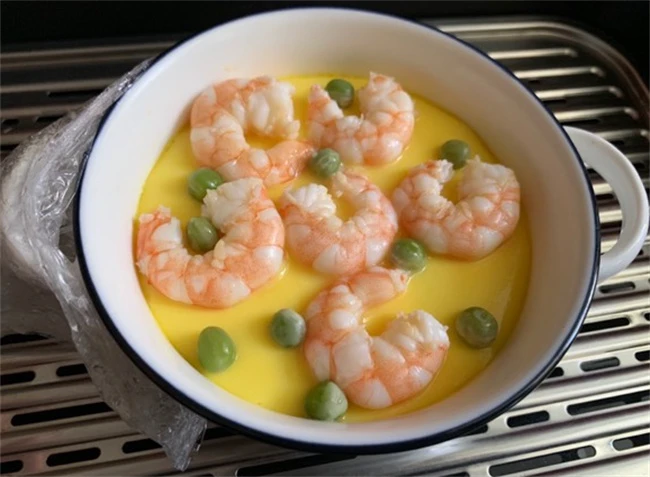 打好的鸡蛋液用漏网过滤两遍,把蛋液里面没有打散的蛋清过滤出来,这样可以让鸡蛋羹更加滑嫩。然后把晚上用保鲜膜盖好拿牙签戳几个洞。冷水上锅,大火烧开之后转成小火,蒸5分钟左右,表面的鸡蛋液凝固拿出来,把虾仁摆在鸡蛋上面,再盖上保鲜膜,放进蒸锅,继续蒸3~5分钟。具体的蒸制时间和火条的大小有直接关系,一般小火慢慢蒸,这样做出来的蛋羹更加滑嫩爽口。