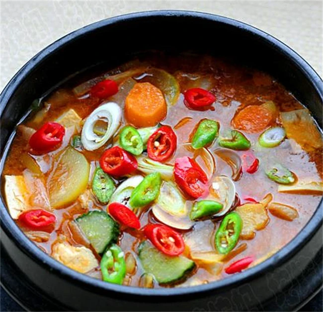 食材要根据耐煮的程度放。先加入土豆蘑菇这些耐煮的食材,然后加入豆腐和西葫芦,煮到变软之后最后把蛤蜊和辣椒圈放进去,中小火炖煮15分钟左右,所有的食材都变软,汤味浓郁即可。如果不喜欢吃太辣的也可以不放辣椒圈。如果不喜欢吃蛤蜊,也可以不放蛤蜊做素的大酱汤,味道也是十分好喝的。浓浓的大酱汤配上米饭味道超级好吃。