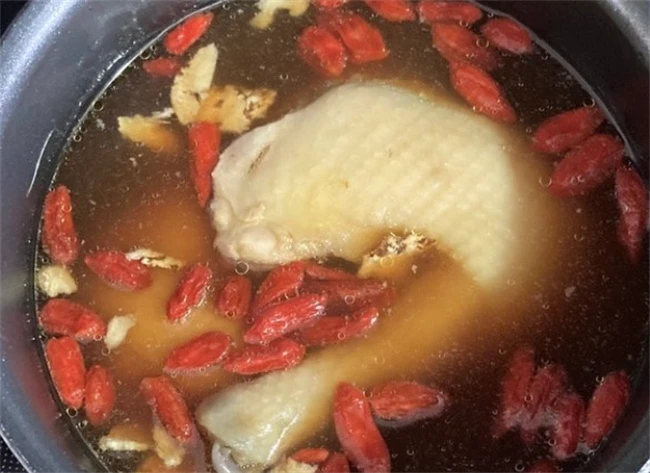 从新起一个锅加入250毫升黄酒当归片枸杞,海盐,再加入适量煮鸡腿的汤,烧开之后关火,然后把鸡腿捞出来放到黄酒里面浸泡好。黄酒冷却之后,把浸泡机头的容器直接放在冰箱里面冷藏,一夜吃的时候取出来多成小块。把放在盘子里面加入枸杞做装饰。切好的鸡腿上面再淋入适量黄酒,直接吃就可以是一道味道非常好的小凉菜,鸡肉吃起来嫩而不柴,也没有腥味儿。