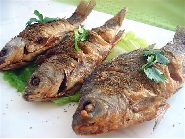 干炸鲫鱼也是特别好吃的,把小一点的鲫鱼洗干净去内脏,两边改善十字滑刀,加入适量盐,白胡椒粉,姜片葱丝搅拌均匀,腌制10分钟左右,锅里面烧油,油温5成热的时候把鲫鱼放进去,小火慢慢的炸。中间有不停的翻动鲫鱼避免一面炸胡,炸成金黄色之后捞出来放在盘子里面,油温升高之后再复炸一次,这样炸出来的鲫鱼又酥又脆,基本上小刺都能吃。