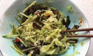 将切好的洋白菜和黑木耳末加入猪肉末中,再加入蚝油和花椒粉等调料,搅拌均匀。