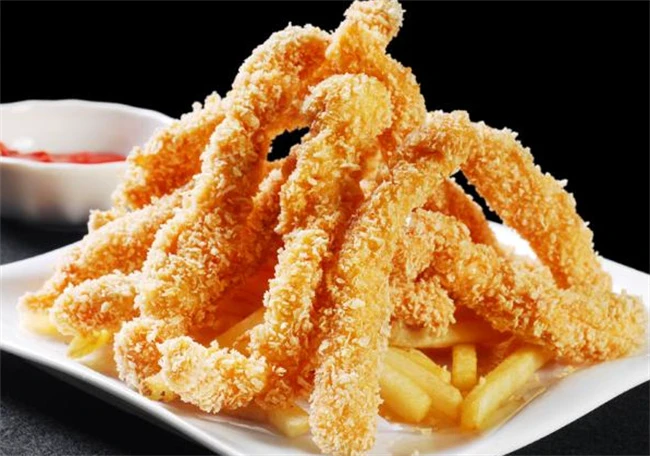 锅里面适量多烧点油。油温5成热的时候把鸡柳一根一根的下到锅里面。鸡柳下到锅里面之后,要把火调成中小火。鸡柳炸至定型之后,再用筷子轻轻翻动,如果翻动的太早,鸡柳没有定型面包糠特别容易脱落。炸鸡柳的过程一定要有耐心,不能火大,如果火太大,鸡柳外面糊了,里面还不熟。中小火大概炸3~5分钟左右,捞出来放在盘子里面,锅里面油温升高之后再次放进去,复炸30秒捞出来就得到了外焦里嫩的炸鸡柳。