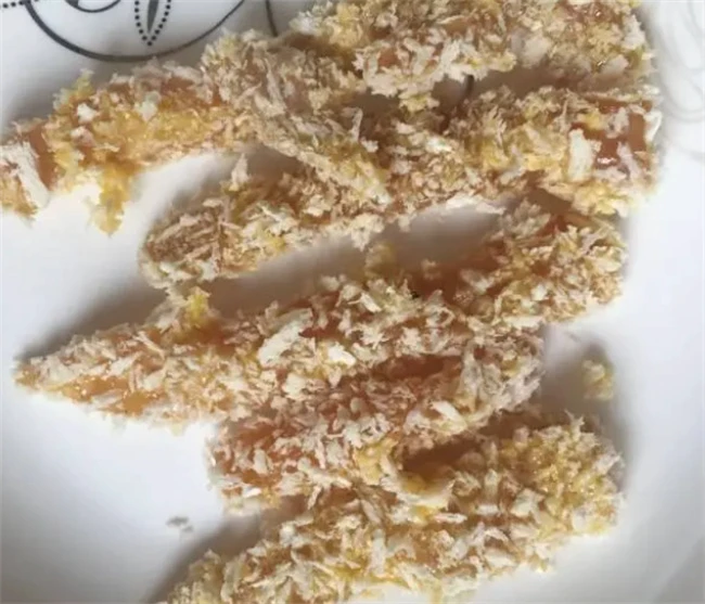 把面包糠倒在盘子里面,用筷子夹住鸡柳挨个裹上面包糠,如果喜欢吃,皮比较厚的也可以裹完面包糠之后再在蛋液里面蘸一下,重新再裹一次面包糠,这样外皮就比较厚,炸出来外焦里嫩。新手的操作方法可能比较生疏,要把所有的鸡柳都裹好,面包糠之后再烧油,不然有很多烧热了鸡柳线下进去的茶,交了后下进去的还没有变色,成熟不一致。