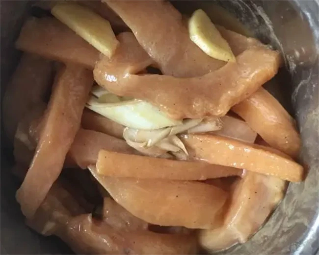 让鸡肉的肉质口感更松软。单拍的时候一定不要力气太大,如果用太大的力气很容易把肌肉完全拍断,这样就做不了炸鸡柳了。一面拍好之后再翻过来把另一面也拍打一下,然后把拍好的鸡肉改成大小合适的条放在碗里面。再把姜切成丝,放到鸡肉里面加入一勺料酒,一勺生抽,一勺蚝油,半勺胡椒粉,半勺盐,一大勺淀粉,再打入一个鸡蛋。带上手套抓匀,腌制15分钟。