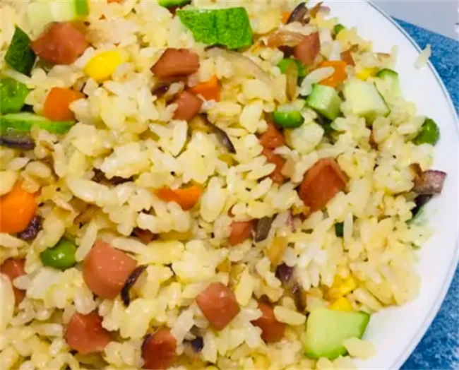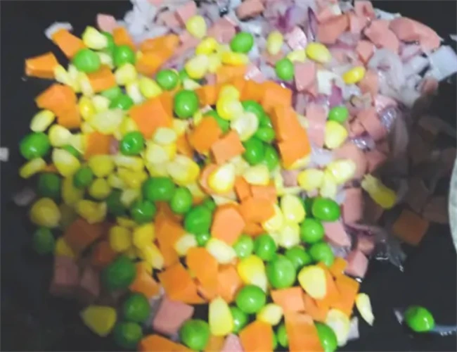 先把火腿切成丁,黄瓜胡萝卜都切成大小合适的丁,先在锅里面烧点清水,把灯清豆放下去,捞出来放在凉水里面冲凉,控干水分备用。把鸡蛋打在碗里面,加入适量食盐和白醋搅拌均匀,加入白醋是为了能够去除鸡蛋的腥味儿,在实验室上鸡蛋有一点底味,这样炒出来香而不腻。炒鸡蛋的火不要开的太大小火,快速翻,炒这样鸡蛋都会炒成小块,如果火太大就变成大块,影响口感。