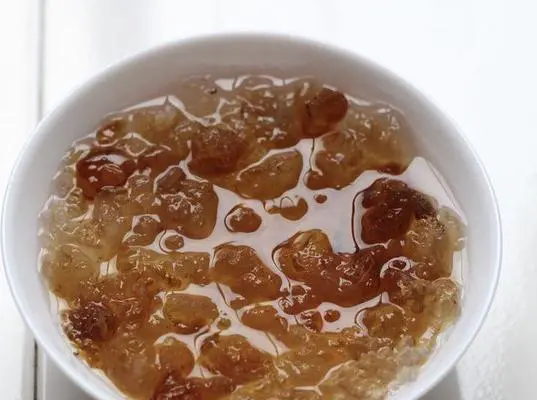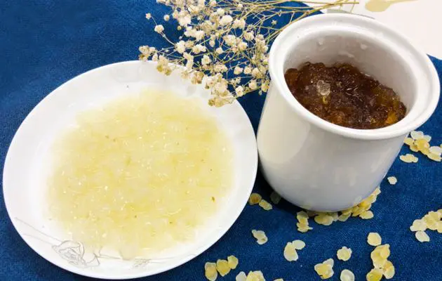 将炖好的雪燕桃胶倒入碗中,最好选择颜色透明的玻璃杯子,这样可以更好地欣赏雪燕桃胶的外观。