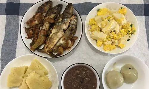 小鱼炒饭是一道简单又美味的早餐。将米饭煮熟备用。接着在锅中加少量油,将小鱼放入锅中煎至金黄色。然后将葱姜蒜切成末放入锅中爆香,接着加入米饭和小鱼一起翻炒均匀即可。
