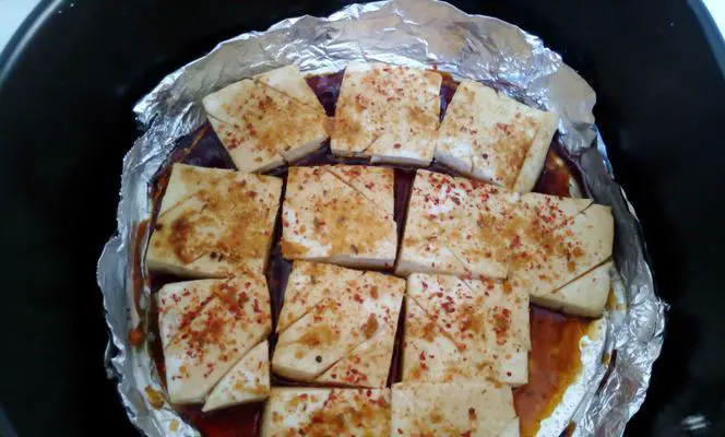 将烤箱预热至200度左右,将腌制好的豆腐放入烤箱中,烤制时间大约在15-20分钟左右。如果想要豆腐表面更加酥脆,可以将温度适当提高一些,但是不要超过230度,否则容易烤糊。