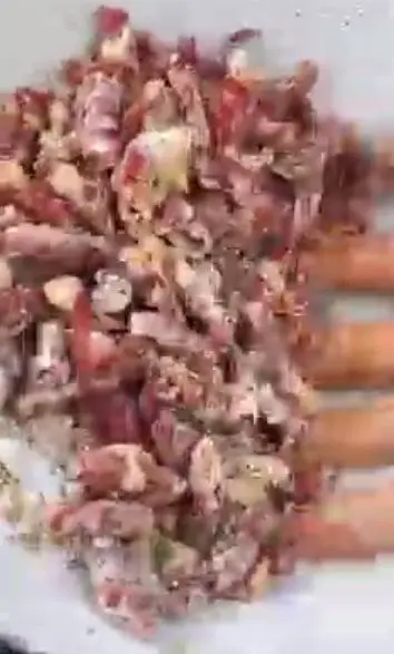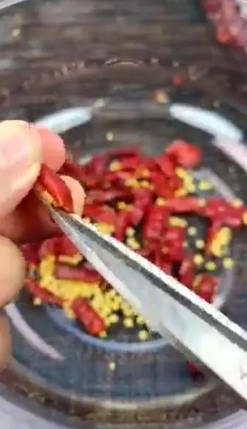 2. 剪好的红椒用漏勺晒出辣椒籽。