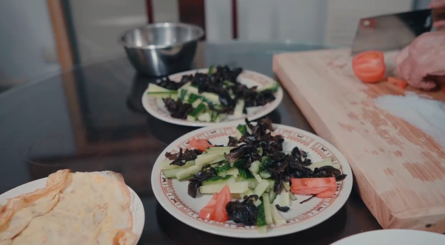 原料:黄瓜,鸡蛋,瘦肉丝,木耳,粉丝,西红柿,葱,姜,大蒜,八角。