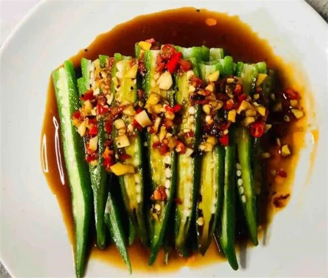 把秋葵买回来以后放在淡盐水里面浸泡一会儿,然后再清洗干净,切掉根部中间用刀划开,锅里面烧点热油,油温大概6成热的时候把秋葵放进去炸舞的十秒钟然后捞出,锅里面烧水放上一点点盐,水开之后把炸过的秋葵放在里面再煮30秒,掏出来过凉水,放在盆子里面拍点蒜末,放上一点辣椒,如果家里面有老人或者孩子的话,就不要放辣椒了,锅里面烧一点油,把油浇在蒜末上面,加入盐味精,一丢丢白糖调个味儿,简单的凉拌秋葵就做好了。
