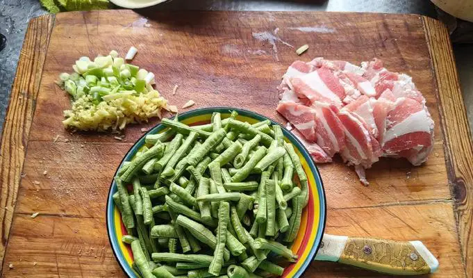 当食材准备齐全后,接下来就是加工处理环节。对于五花肉,需要去皮去骨切成块状;对于芸豆,需要去蒂去丝洗净备用。同时,还需要将葱姜切碎备用。