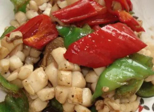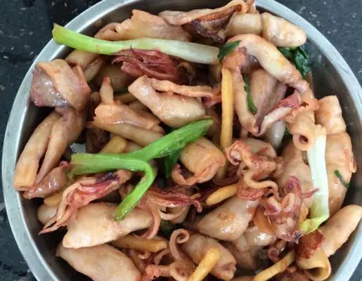 炒香姜蒜和辣椒,放入鱿鱼耳炒制。
