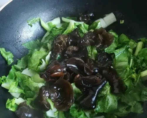 当木耳丝变软后,加入小青菜段。