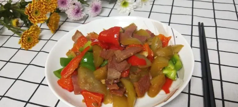 待护子瓜变得略微透明后,将青椒和红椒的条状炒至七八成熟,加入适量的生抽、老抽和鸡精进行调味。这里的生抽和老抽可以让菜肴更具有鲜美口感,而鸡精则可以增强菜肴的香味。
