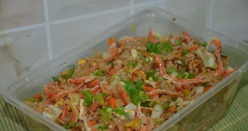 将之前炒制好的虾仁加入锅中,与米饭和菜蔬混合均匀。