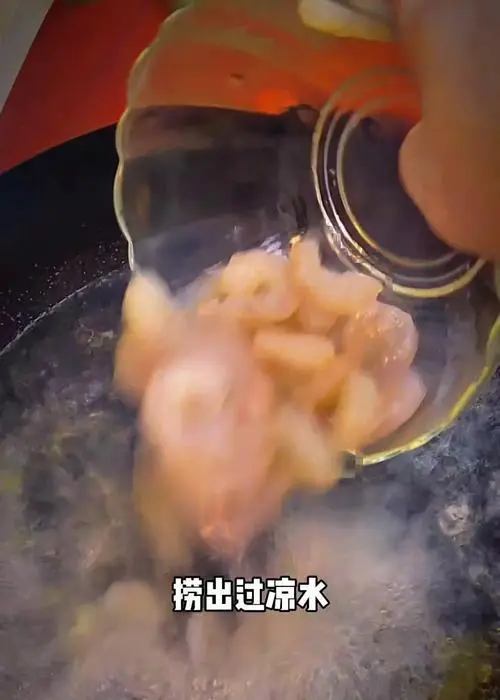 将锅中余油倒掉,然后重新加热,加入虾仁炒制,待虾仁变色后,捞出备用。